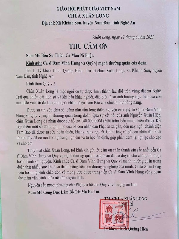 Nam ca sĩ cũng chia sẻ luôn thư cảm ơn từ phía nhà chùa để minh chứng (Ảnh: FBNV)