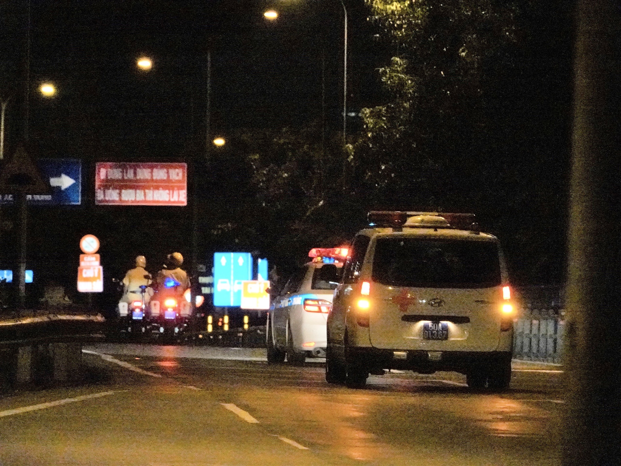 Đúng 0 giờ 50 phút, CSGT TP.HCM mở đường dẫn đoàn xuất phát từ đường dẫn cao tốc. Suốt dọc đường đi, đến giao lộ nào CSGT trực ở các chốt cũng chuẩn bị điều tiết giao thông sẵn sàng.
