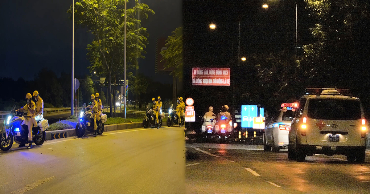 23 giờ 30 phút, tổ dẫn đoàn gồm 8 CSGT với 4 xe mô tô đặc chủng Honda NC750 có mặt tại đường dẫn cao tốc. Vừa có mặt, tổ dẫn đoàn báo về bện.h vi.ện để các y bác sĩ sẵn sàng chuẩn bị dụng cụ.