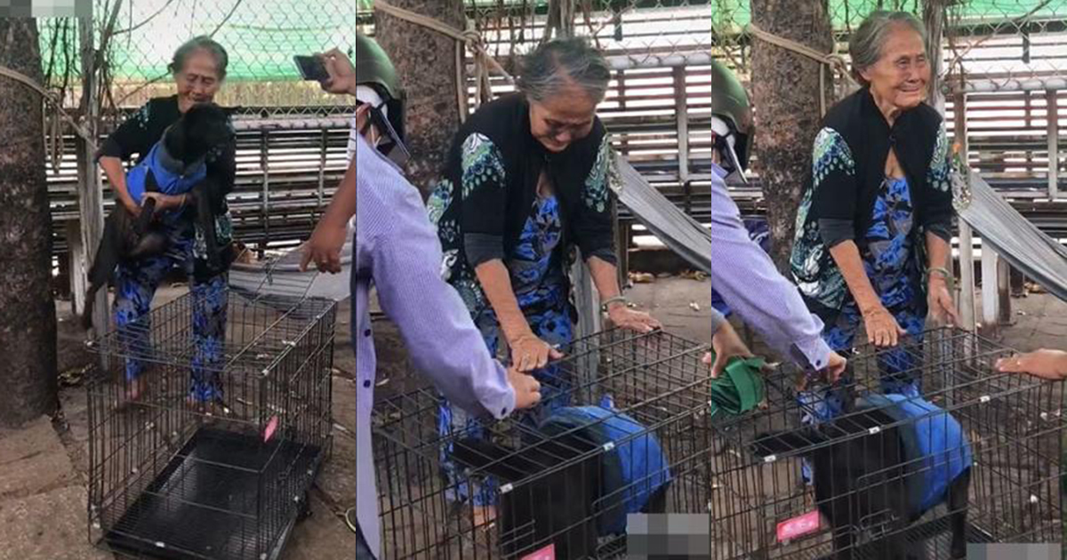 Cận cảnh cụ già giao cún cưng cho người khác nuôi hộ.