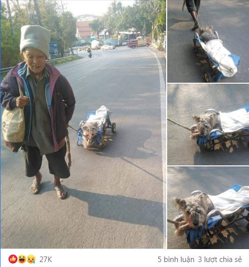 Trước đây câu chuyện về bà cụ kéo xe đưa cún cưng về nhà khiến dân tình cảm động. Trên đường, bà cụ ăn mặc khá rách rưới khi quần áo cũ kỹ, một tay khoác túi xách đã rách, một tay kéo xe đẩy. Trên chiếc xe nhỏ, chú cún đang nằm ngoan ngoãn. Cún cưng dường như không thể đi lại được.
