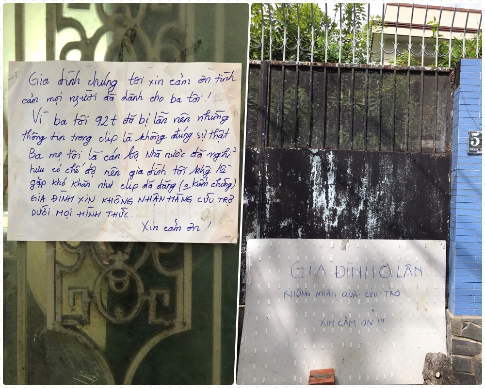 “Ba mẹ tôi là cán bộ Nhà nước đã nghỉ hưu và có chế độ nên không hề gặp khó khăn như trong clip đã đăng tải. Ông đã 92 tuổi rồi, bị lẫn nên mới nói như vậy. Thế nên, gia đình tôi xin không nhận quà hỗ trợ dù dưới hình thức nào. Chúng tôi xin ghi nhận những tấm lòng và gửi lại các phần quà cho những hoàn cảnh khó khăn hơn”, chị nói thêm.