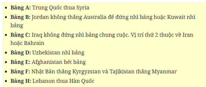 Theo đó, đội tuyển Việt Nam nằm trong top 5 đội nhì bảng ở lượt cuối, nếu 3 trong 7 bảng còn lại xảy ra điều này: