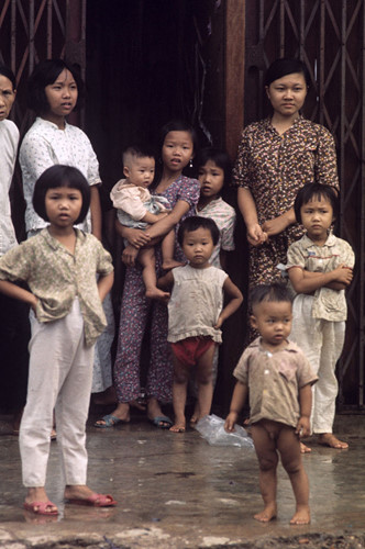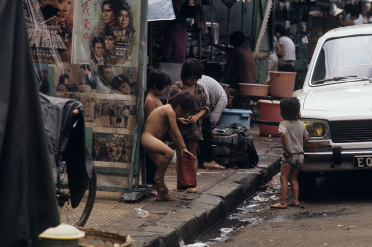 Trẻ em đường phố tụ họp trên vỉa hè Sàɨ Gòп, cạnh chiếc xe hơi Peugeot 504.