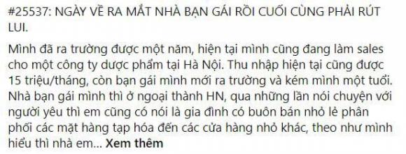 Một anh chàng làm nhân viên kinh doanh, lương tháng 15 triệu vừa viết bài tâm sự về chuyện tình yêu của mình. Nhà anh cách nhà bạn gái 140km, về kinh tế thì gia đình cô khá giả hơn anh. Trong ngày về ra mắt gia đình nhà bạn gái, anh đã có quyết định của riêng mình. Đó là anh sẽ chia tay cô bạn gái xinh xắn vì gia đình cô đã chọn người con trai khác giàu có hơn để làm rể.
