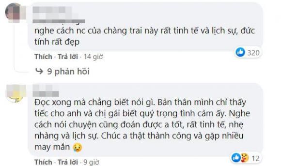 – Đọc xong mà chẳng biết nói gì. Bản thân mình chỉ thấy tiếc cho anh và chị gái biết quý trọng tình cảm ấy. Nghe cách nói chuyện cũng đoán được anh tốt, rất tinh tế, nhẹ nhàng và lịch sự. Chúc anh thật thành công và gặp nhiều may mắn.