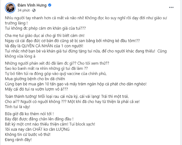 Tự bỏ tiền túi ra đóng góp vào quỹ vaccine của Chính phủ. Mua giường bệnh cho bệnh viện dã chiến. Cùng bạn bè mua gần 10 tấn gạo và mấy trăm ngàn hộp cá phát cho dân nghèo. Mấy cái đó tôi ra vườn lượm vô à? Toàn thánh tướng! Mỗi loại rau cái nửa ký, cái vài lạng. Trái thì một trái, cho ai? Người có người không? Một khi đã cho hay từ thiện là phải cả xe. Tính tôi là vậy! Bữa giờ đã không thèm nói tới. Bày đặt được đằng chân lân đằng đầu. Bất kỳ một bình luận nào thiếu thiện cảm. Tôi chặn sạch! Tôi xưa nay cần chất không cần lượng. Không tin cứ bước vô thử! Đang rảnh đây!“.