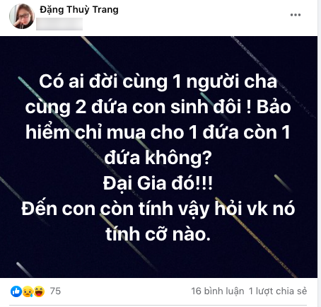Chị Thùy Trang viết: “Có ai đời cùng 1 người cha cùng 2 đứa con sinh đôi, bảo hiểm chỉ mua cho 1 đứa còn 1 đứa không? Đại gia đó, đến con còn tính vậy hỏi vợ nó tính cỡ nào. Một thằng đàn ông ngoại tình, nhậu nhẹt, động tay động chân với vợ những ngày mang bầu sinh đôi, rồi thêm lúc đẻ con rồi bảo vợ ăn bám, gây nợ nần. Đó có phải là 1 thằng đàn ông tồi và thất bại không?