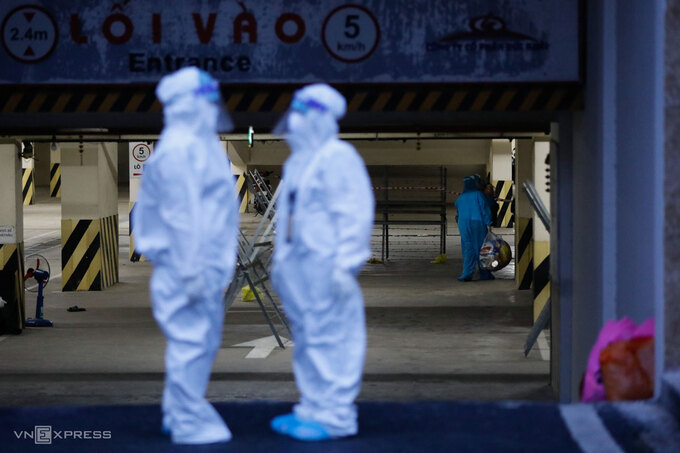 Hai nhân viên y tế trong bộ đồ bảo hộ cấp 4 trước Bệnh viện dã chiến số 3, quy mô 3.000 giường, đặt tại một chung cư tái định cư phường An Khánh, TP Thủ Đức, tháng 7/2021. Ảnh: Hữu Khoa