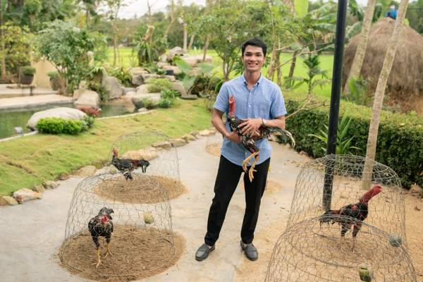 Cậu con trai này cũng làm hẳn 1 khu sân vườn để lấy chỗ chăm sóc và nhốt gà chọi. Vì là người chuyên làm về tiểu cảnh nên anh đã làm hồ cá Koi rộng 20m2 trước nhà làm tiểu cảnh dễ thương cho ba mẹ ngắm.