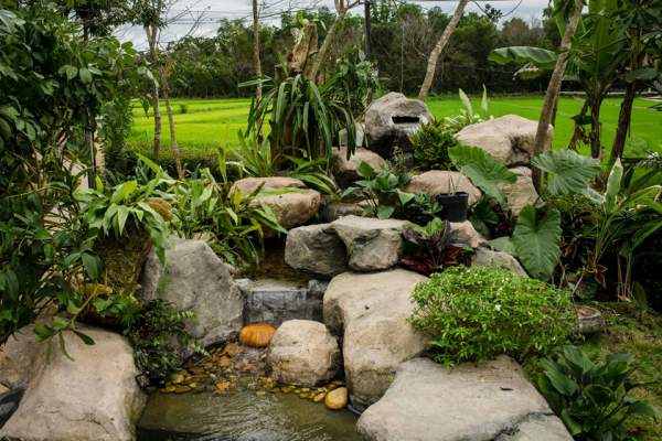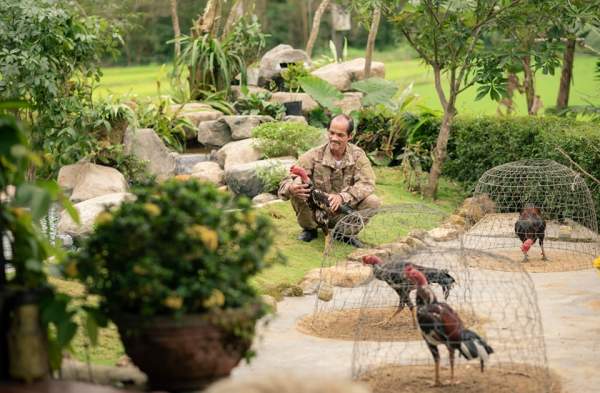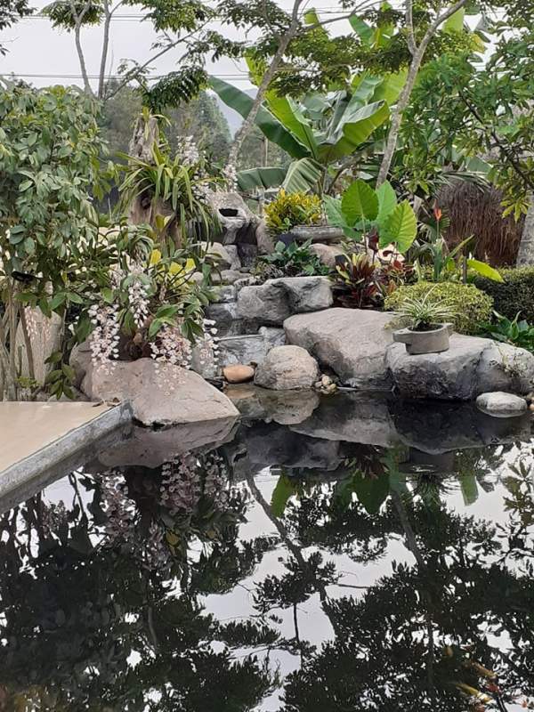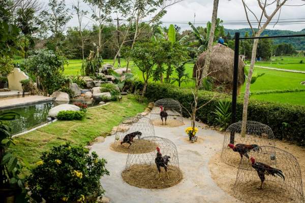 Cậu con trai này cũng làm hẳn 1 khu sân vườn để lấy chỗ chăm sóc và nhốt gà chọi. Vì là người chuyên làm về tiểu cảnh nên anh đã làm hồ cá Koi rộng 20m2 trước nhà làm tiểu cảnh dễ thương cho ba mẹ ngắm.