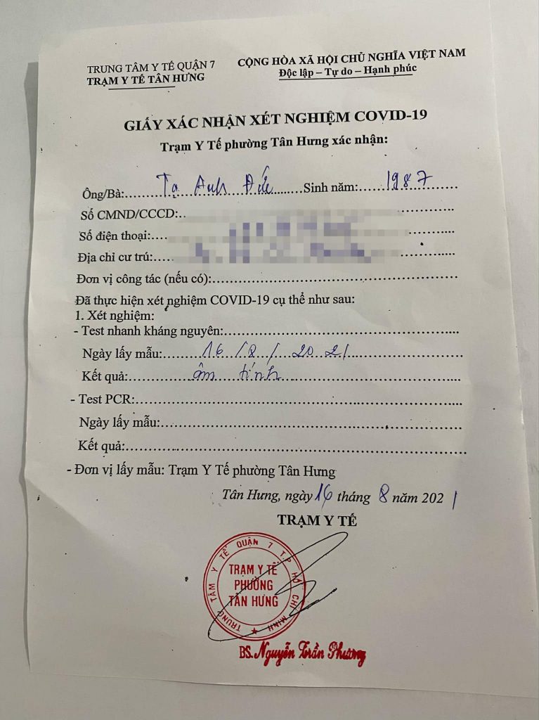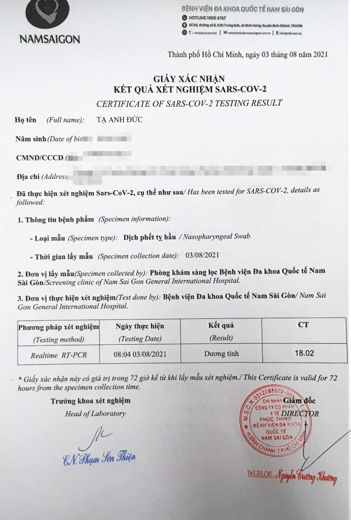Ngày 2/8, tôi test nhanh lần nữa vẫn lên 2 vạch rõ ràng sắc nét. Lúc này tôi tìm hiểu thông tin để test PCR, có 1 vài số điện thoại nhận test tại nhà. Chú ý phải tìm hiểu rõ nhé, họ nói có dấu của bệnh viện, đến xét nghiệm và trả kết quả tận nhà. Tôi gọi đến bệnh viện thì bệnh viện không nhận xét nghiệm tại nhà nữa. Nên không dám chắc họ làm đúng hay không, và dịch vụ này cũng không rẻ. Lưu ý lại nếu không thực sự cần thiết thì cũng không nên đi đến bệnh viện test nha đi thì nhớ bảo hộ kỹ càng. May là nhờ có Hải Yến hỗ trợ tôi rất nhiều. Nên mới thấy quyết định mua bảo hiểm của em là điều đúng đắn.