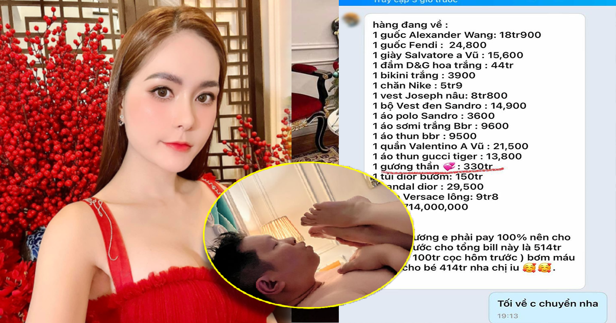 Liếc sơ qua có thể thấy được toàn là những món đồ của thương hiệu đình đám với giá khá chát. Cô đã cọc và chuẩn bị chuyển tiền, chỉ cần chờ “đập hộp” nữa mà thôi. Trong đó chỉ có 1 vài món của con gái, ông xã ké 1 đôi giày và 1 chiếc quần số còn lại là của Đoàn Di Băng tất cả. Tổng chi phí sắm Tết sương sương của nữ lên tới hơn 700 triệu đồng, chưa hết doanh nhân Nguyễn Quốc Vũ còn than thở “đây là hóa đơn thanh toán lần thứ “n” trong tháng này, chắc đem bả đi thanh toán cho rồi quá”, đúng là 3 phần bất lực, 7 phần yêu thương.