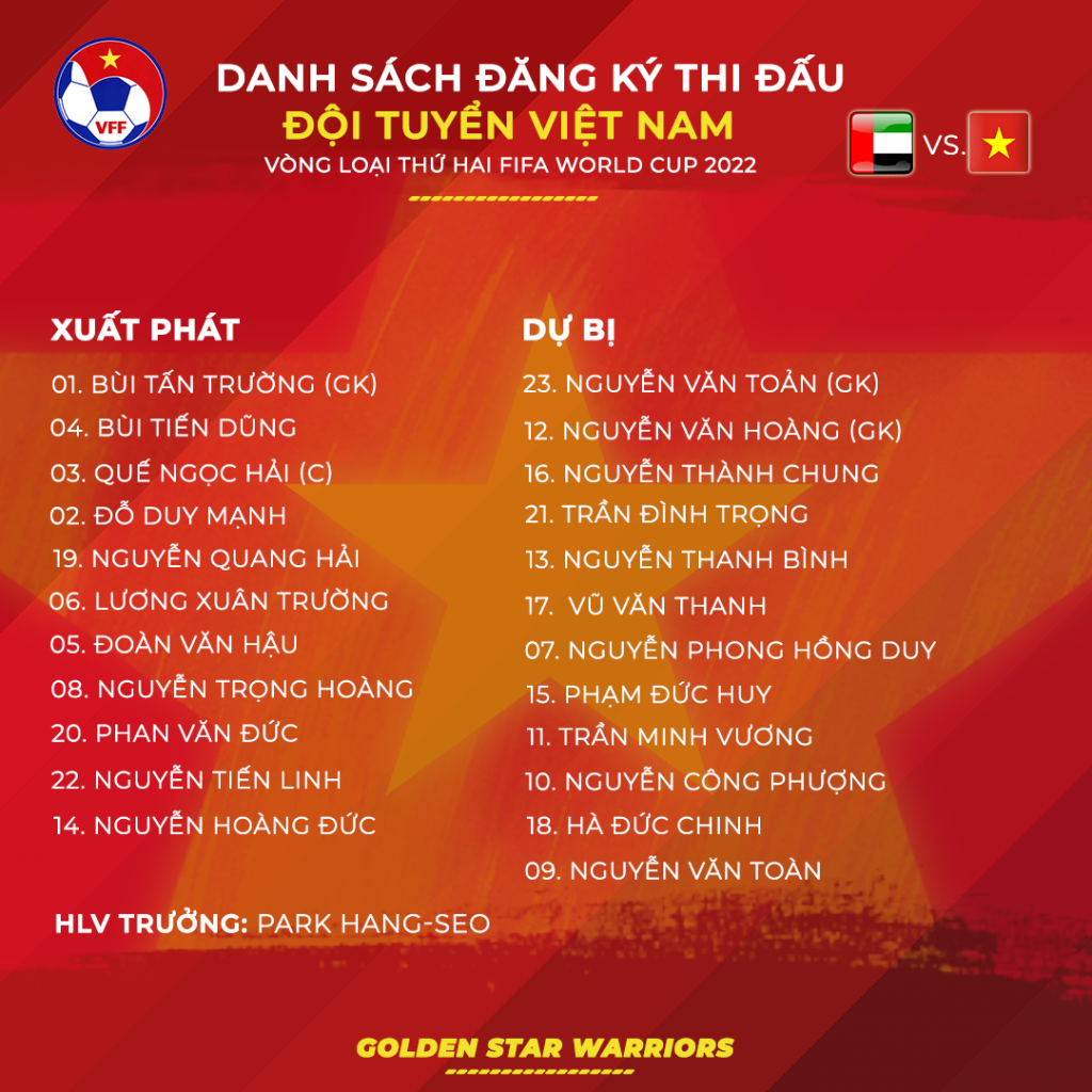 Trong khi đó, ĐT Việt Nam vẫn đang nắm quyền tự quyết trong tay (hơn UAE 2 điểm trên BXH) và có thể chủ động trong những toan tính chiến thuật. Với tài dụng binh của thầy Park cùng khả năng phòng ngự chắc chắn của các cầu thủ đội nhà, chúng ta vẫn có thể nghĩ đến một kết quả tốt. Trận đấu nhiều khả năng sẽ diễn ra rất căng thẳng và không nhiều bàn thắng được ghi.