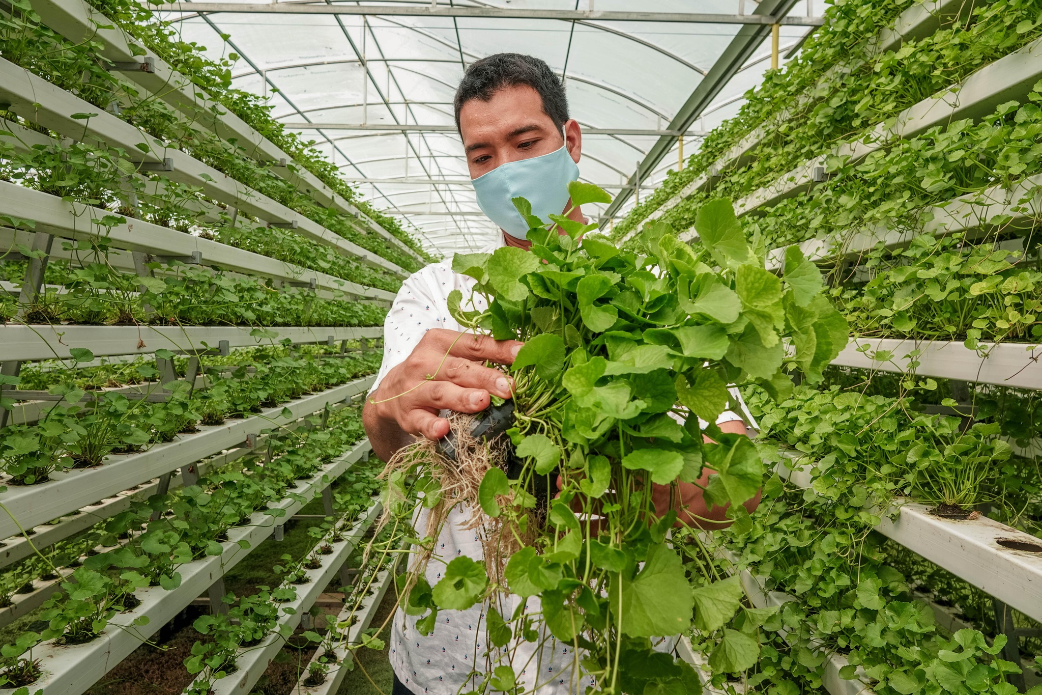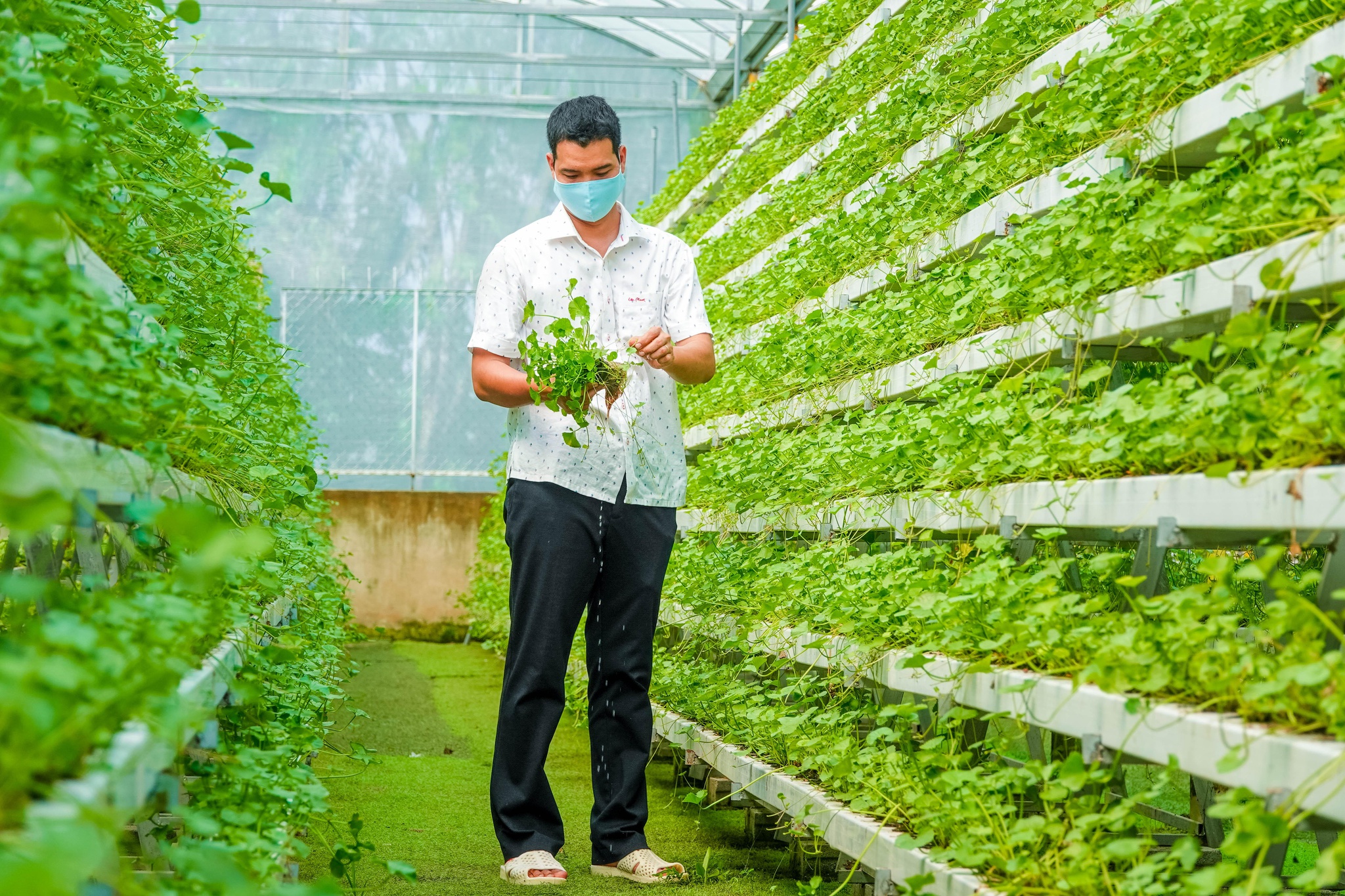 Tháng 5.2020, anh chi gần 1,5 tỉ đồng đầu tư trồng rau má Vietgap theo hướng công nghệ cao, lắp đặt hệ thống nhà kính, giàn thủy canh tưới tự động, máy sấy lạnh… trên diện tích 700 m2. Hệ thống chăm sóc hoàn toàn tự động, được thao tác trên điện thoại. Từ kinh nghiệm sẵn có của một kỹ sư nông nghiệp, anh Beo tự pha trộn phân, thuốc để rau phát triển tốt, khống chế được độ đắng, độ lạt của rau má.