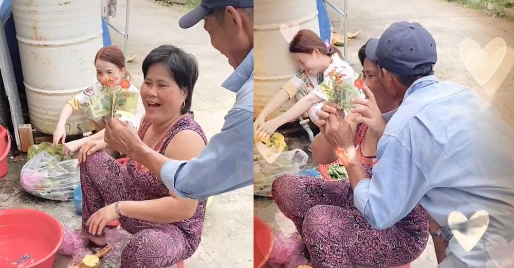 Mặc dù cuộc sống tất bật, và ở quê, người ta không quá chú trọng chuyện quà cáp, lời chúc ngày 20/10 nhưng anh vẫn quyết tạo bất ngờ cho vợ từ những điều giản dị nhất. Không kịp chuẩn bị quà chu đáo, người chồng lấy 2 tờ tiền mệnh giá 100 nghìn đồng, gắn thêm ít bông hoa mười giờ để tặng vợ. Khi thấy chồng đưa quà trước mặt, người vợ không khỏi bất ngờ, ngại ngùng nhìn con gái rồi cười lớn.