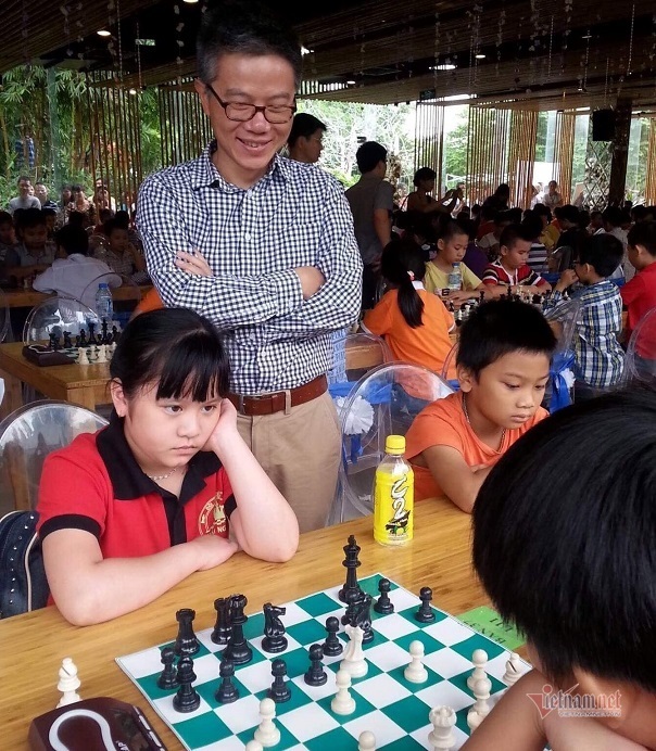GS Ngô Bảo Châu quan sát ván đấu của kỳ thủ nhí Nguyễn Thiên Ngân tại giải Cờ vua do Vườn ươm Tài năng Talinpa tổ chức. Ở giải đấu này, Thiên Ngân giành ngôi vô địch.