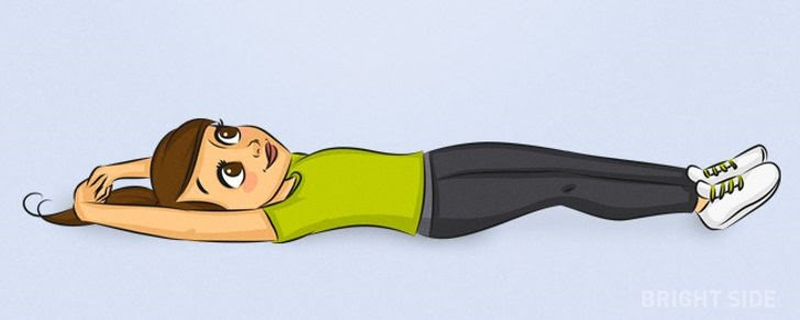 Nằm ngửa, 2 tay đưa lên đầu, đan 2 tay vào nhau, chân duỗi thẳng.