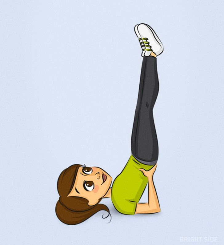 Đưa 2 chân lên cao đồng thời 2 tay chống hông để nâng cao thân người, nâng cao chân, 2 lòng bàn chân hướng về phía trần nhà.