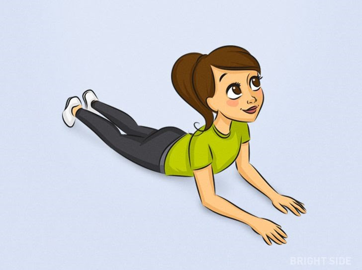 Trong tư thế nằm sấp dưới sàn, 2 khủy tay chống xuống sàn, bàn tay thẳng đồng thời úp lòng bàn tay. Đẩy thân người hết mức có thể về phía sau. Đầu ngửa về phía sau. Giữ tư thế này ít nhất 30 giây.