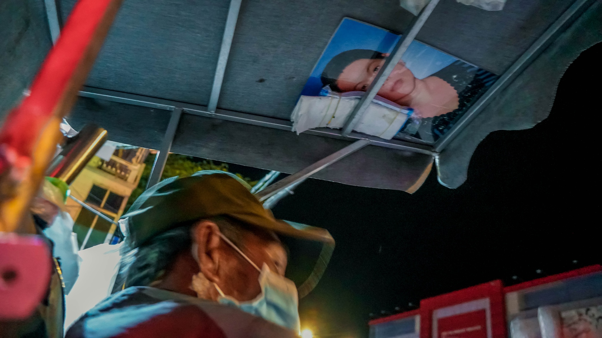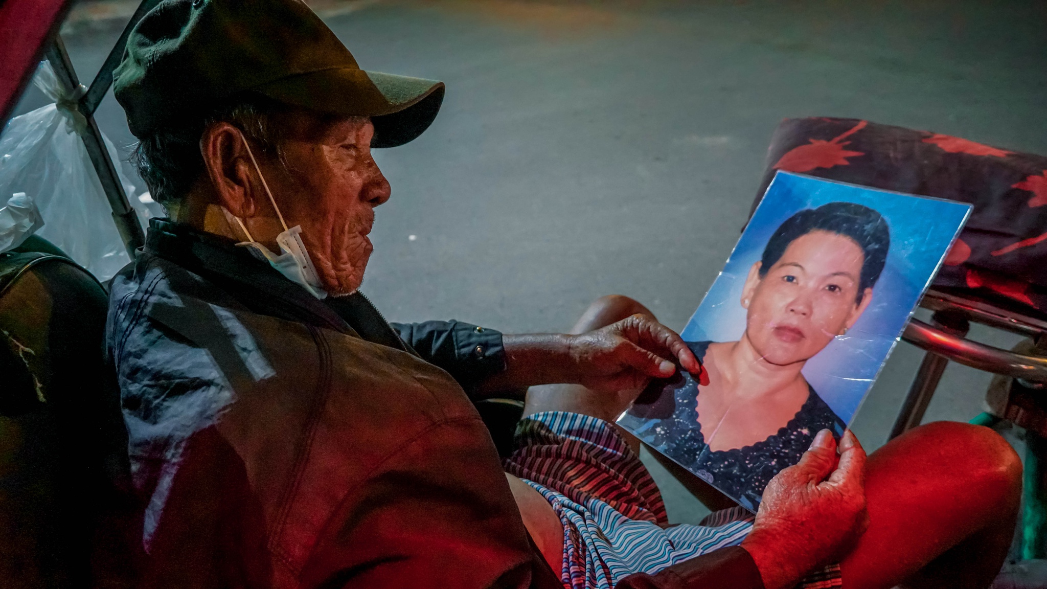 Đưa tay lên trần xe lấy di ảnh người vợ quá cố, mà nước mắt cụ Quý chực trào. Cụ kể: “Vợ tôi mất hơn 15 năm rồi. Lúc trước nghèo quá vợ chồng chưa bao giờ chụp chung được tấm ảnh. Giờ chỉ còn lại 2 tấm ảnh của bả, tôi rửa ra khổ to để trên mái xe giữ lại làm kỷ niệm, khi nào nhớ quá tôi lại đem ra ngắm. Thấy ảnh bả cười tôi mới có thể vượt qua cơn bĩ cực cuộc đời để cố gắng sống tiếp”.