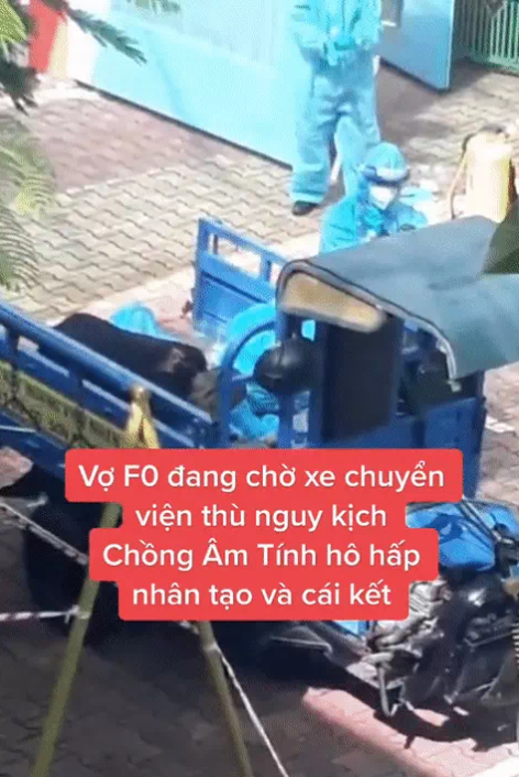 Không rõ khi thời gian clip được quay (ngày 29/8), chị đang cách ly tại nhà hay tại cơ sở y tế, chỉ biết bên ngoài có bảng thông điệp 5K. Chị mặc đồ bảo hộ màu xanh, nằm trên chiếc xe ba gác với chồng quỳ ngay cạnh. Gần đó, có 2 người cầm theo bình xịt khuẩn loại lớn, đang hoàn tất việc mặc đồ bảo hộ.