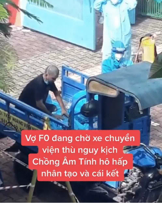 Theo người quay clip chia sẻ, người vợ của anh áo đen bị nhiễm bệnh, là một bệnh nhân Covid-19. Người này thông tin, cô vợ bất ngờ trở nặng khi đang chờ xe đến đón để chuyển viện.