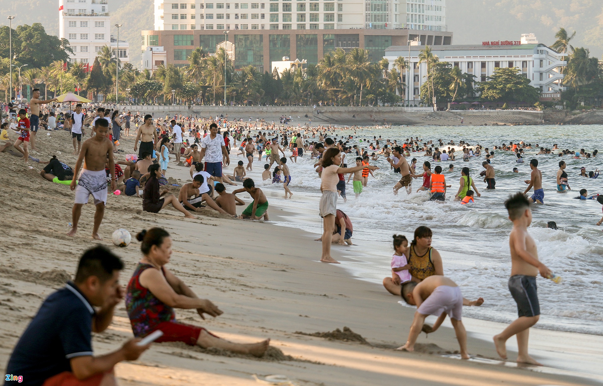 Thời tiết Nha Trang những ngày này nắng nóng, nên bãi biển Nha Trang đông nghịt người dân đi tắm vào các buổi chiều.