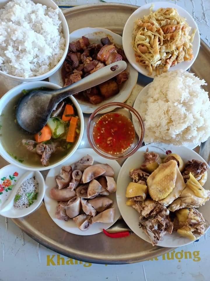 Mâm cơm nóng hổi với đầy đủ các món ngon như thịt kho, gà luộc, bát canh sườn rau củ, măng xào và cơm trắng gửi tới các chiến sĩ công an.