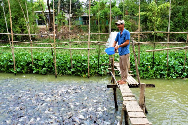 Đàn cá tra tự nhiên, đang “ở nhờ” tại nhà bà Nguyễn Thị Mai ngụ tại ấp Phú Quới, xã Phú Thành, huyện Phú Tân, tỉnh An Giang. Bà Mai cho biết, những vị khách không mời này bắt đầu kéo đến bờ sông nhà bà đã 1 năm nay.