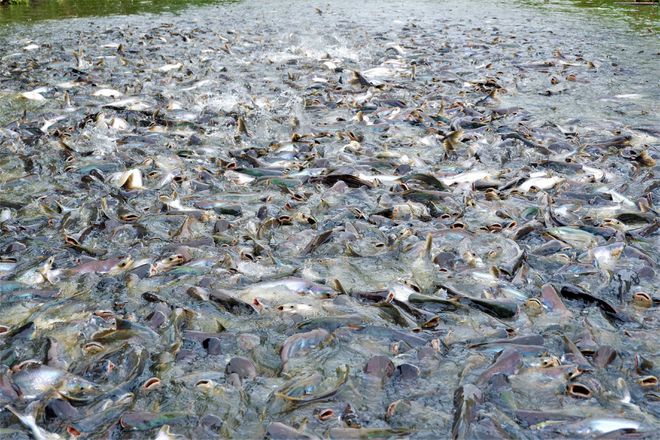 Đàn cá tra tự nhiên, đang “ở nhờ” tại nhà bà Nguyễn Thị Mai ngụ tại ấp Phú Quới, xã Phú Thành, huyện Phú Tân, tỉnh An Giang. Bà Mai cho biết, những vị khách không mời này bắt đầu kéo đến bờ sông nhà bà đã 1 năm nay.