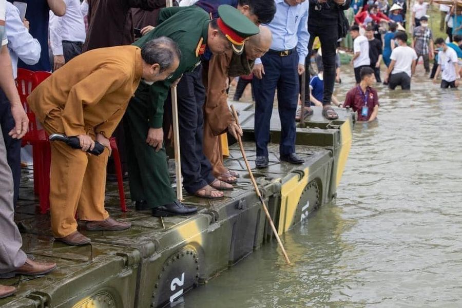 Có một hiện tượng rất lạ đã xảy ra khi mọi người đang làm lễ phó.ng s.inh. Đó là bỗng bên kia sông rất nhiều r.ắn nước, nhiều vô kể, ngóc đầu bơi nhanh băng qua sông đến bò trườn đùa giỡn nơi chiếc phà có Thượng tọa Thích Chân Quang, có quý thầy tụng kinh, có các quan khách chính quyền đến dự, có các chỉ huy lữ đoàn công binh đến hỗ trợ.