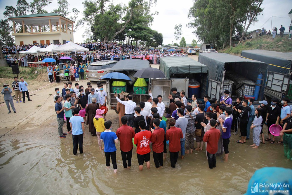 Cá ph.ón.g s.inh gồm cá loại trôi, mè trắm được nhà chùa mua từ các trại cá giống trong tỉnh, đảm bảo chất lượng. Từng bì cá, chậu cá được mọi người thả xuống sông Lam trong lời cầu nguyện ph.óng si.nh. Ảnh: Huy Thư