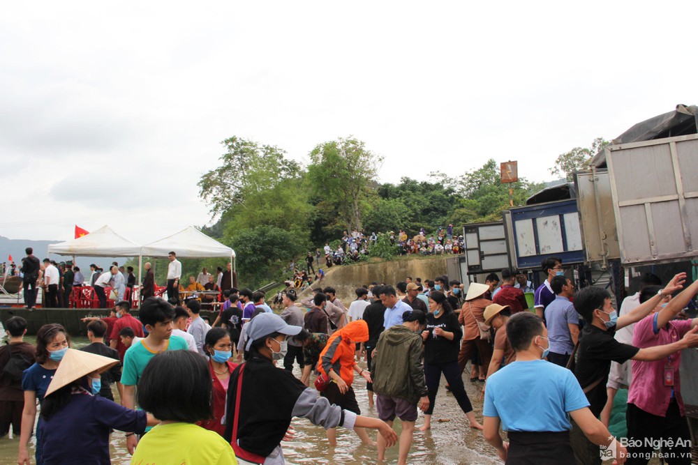 Tại buổi p.hó.ng s.in.h có hơn 10 chiếc xe ô tô vận chuyển 10,4 tấn cá phón.g sin.h cập sát bến sông Lam. Khoảng 100 thanh niên, sinh viên tình nguyện đã có mặt tại đây để chuyển cá từ trên xe ra thả giữa sông. Ảnh: Huy Thư