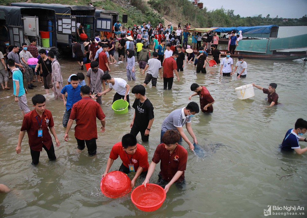 Chùa Viên Quang xã Nam Thanh (Nam Đàn) vừa tổ chức lễ ph.óng si.nh thả 10,4 tấn cá xuống sông Lam. Địa điểm phó.ng sin.h tại bến sông Lam gần khu di tích Mộ Vua Mai, thị trấn Nam Đàn. Ảnh: Huy Thư