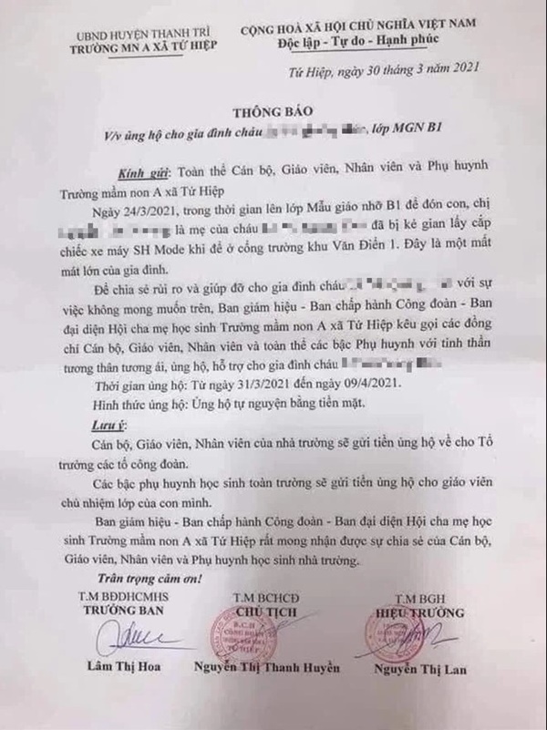 Đến ngày 31/3 văn bản kêu gọi được đăng tải với nội dung: “Ngày 24-3-2021, trong thời gian lên lớp Mẫu giáo nhỡ B1 để đón con, chị N.T.P. là mẹ của cháu L.V.Q.Đ. đã bị kẻ gian lấy cắp chiếc xe SH mode khi để ở cổng trường khu Văn Điển 1.