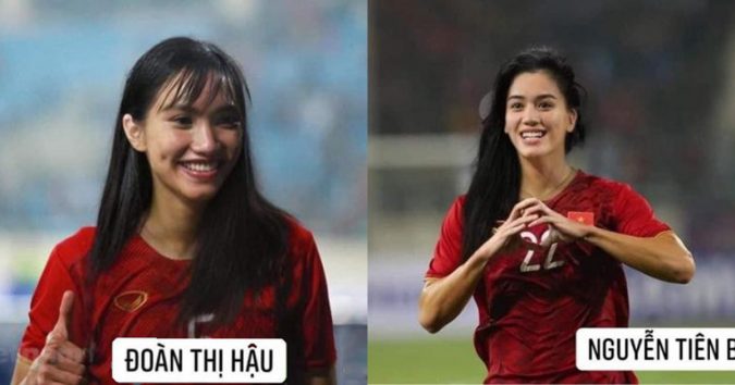 Đặc biệt hơn cả là những bức hình cho các cầu thủ giả nữ. Từ Quang Hải, Công Phượng, Tiến Linh, Văn Hậu, Xuân Trường… đều được đội một mái tóc giả dài, tạo hình tượng nữ.