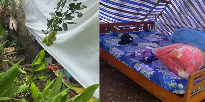 Theo đó, không chỉ chuẩn bị cho con gái một căn lều bằng bạt giữa vườn, xung quanh đầy ắp các loại trái cây mà bố mẹ cô còn trang bị đầy đủ bình nước, bếp, dụng cụ nấu ăn, khu giặt đồ, rửa bát,… Chỉ nhìn thôi đã thấy quá gần gũi với thiên nhiên.