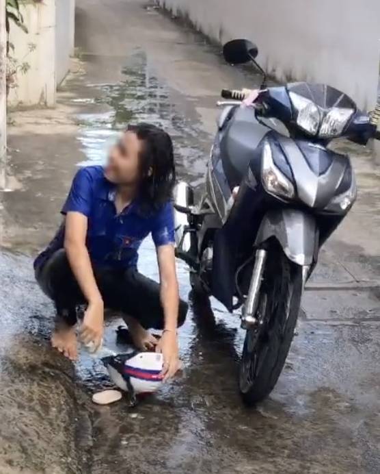 Cô gái cẩn thận rửa luôn cả mũ bảo hiểm. (Ảnh: Chụp màn hình)