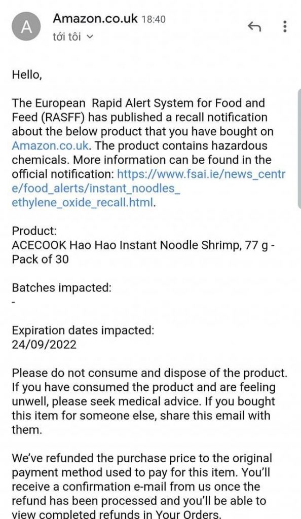 Theo ghi nhận của Zing, một khách hàng sau khi mua sản phẩm mì Hảo Hảo vị tôm chua cay của Acecook thông qua sàn Amazon UK đã nhận được email thu hồi. Amazon UK cho biết quyết định do Hệ thống Cảnh báo Nhanh về Thực phẩm và Thức ăn chăn nuôi châu Âu (RASFF) ban hành. Khách hàng sau khi hoàn hàng sẽ được sàn trả lại tiền.