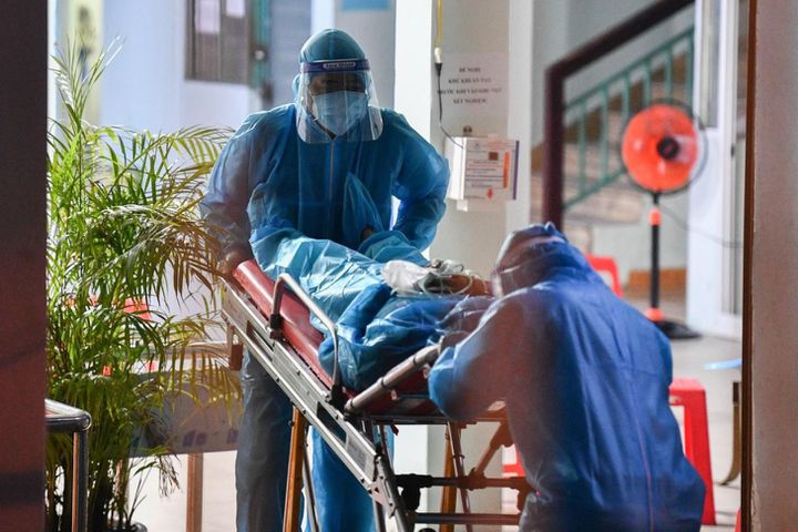 Một bệnh nhân Covid-19 chuyển biến nặng được nhân viên y tế quận Gò Vấp chuyển lên Bệnh viện Bệnh Nhiệt đới TP.HCM. Ảnh: Duy Hiệu.