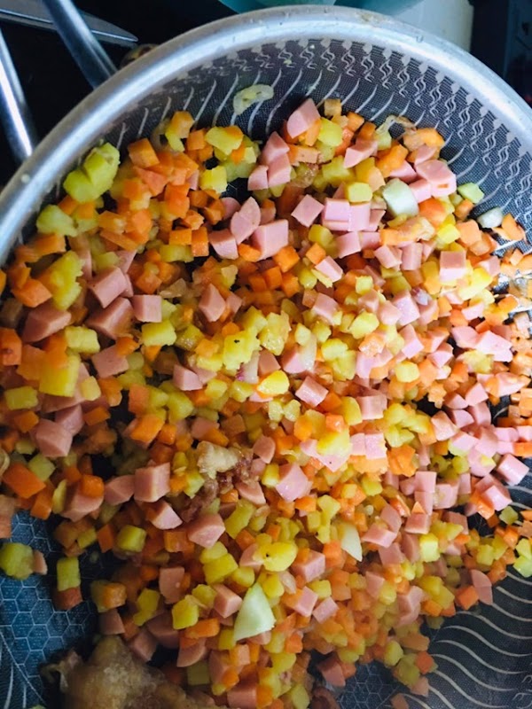 Bước 1: Tiến hành sơ chế và thái hạt lựu dưa chuột, cà rốt, khoai lang tím, xúc xích; hành khô băm nhỏ.