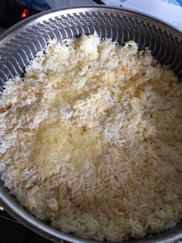 Bước 6: Thêm dầu ăn vào chảo, bỏ cơm vào chiên nhỏ lửa trong 3 phút rồi đảo đều và để thêm 3 phút nữa. Sau đó, đổ lòng trắng trứng vào đảo đều cho đến khi hạt cơm tơi.