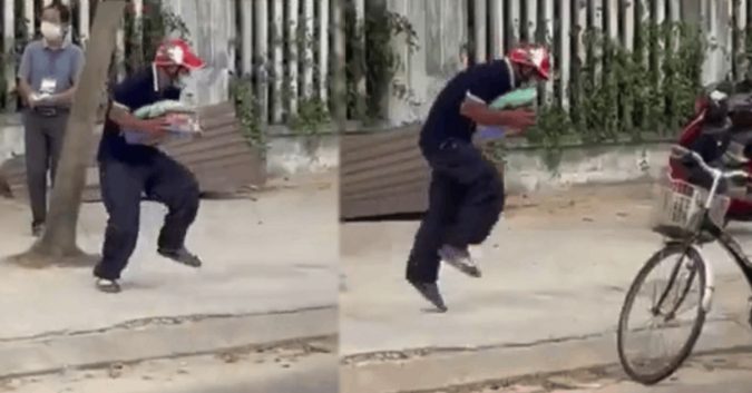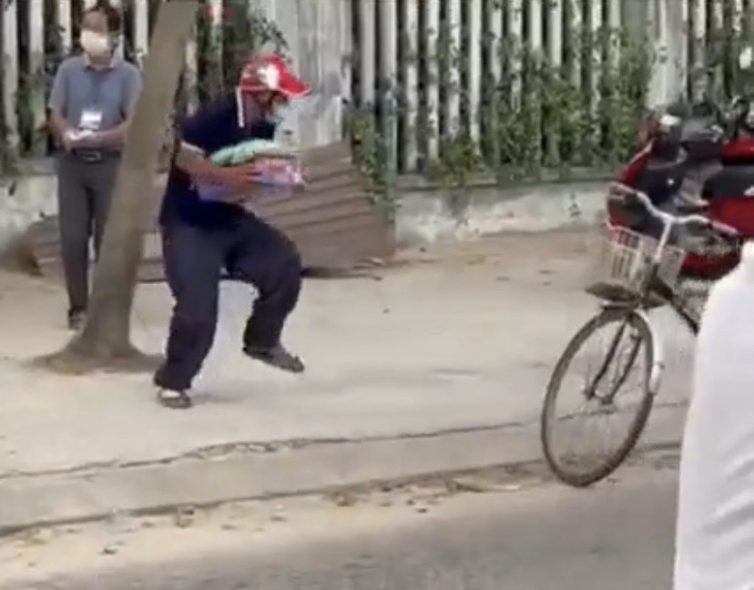 Mới đây, trên mạng xã hội xuất hiện đoạn clip ghi lại cảnh người đàn ông sau khi được phát gạo từ thiện đã “nhảy cẫng” lên như một đứa trẻ vì vui sướng. Sau đó, anh nhanh chóng chạy tới chiếc xe máy của mình, cất gọn bao gạo và thùng mì tôm để chuẩn bị rời đi.