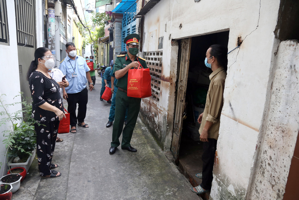 Đại diện Bộ tư lệnh TP.HCM tặng quà cho bà con vào ngày 8/8. (Ảnh: Tuổi trẻ Online)