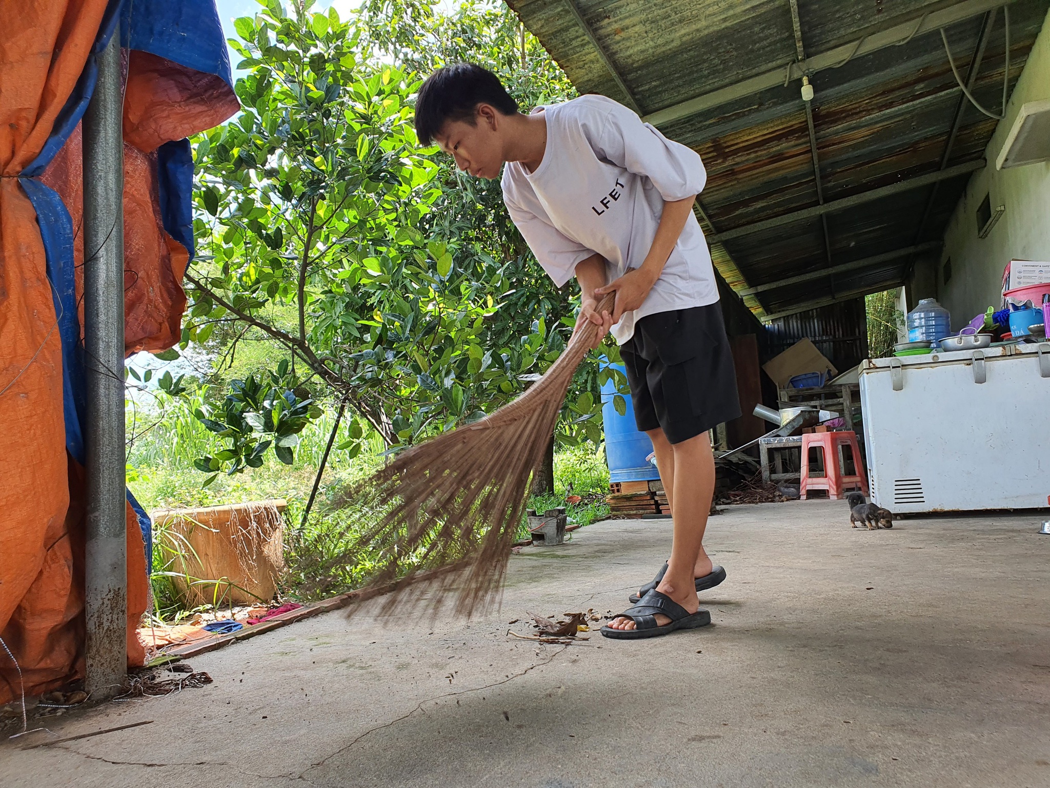 Tan học, cậu học trò nhỏ bé ở lại quét lớp, lau sàn, kê lại bàn ghế cho thật ngay ngắn. Sự lao động chăm chỉ này đã giúp Thường được giảm tới 90% học phí trong suốt 3 năm THPT, số tiền không nhỏ với hai chị em.