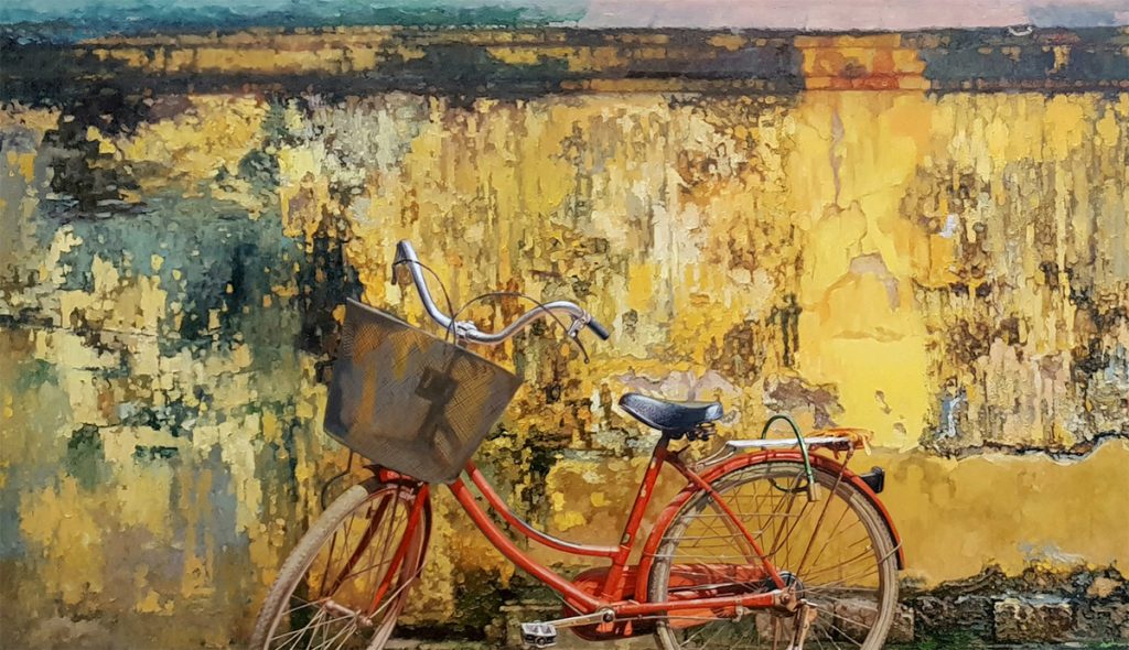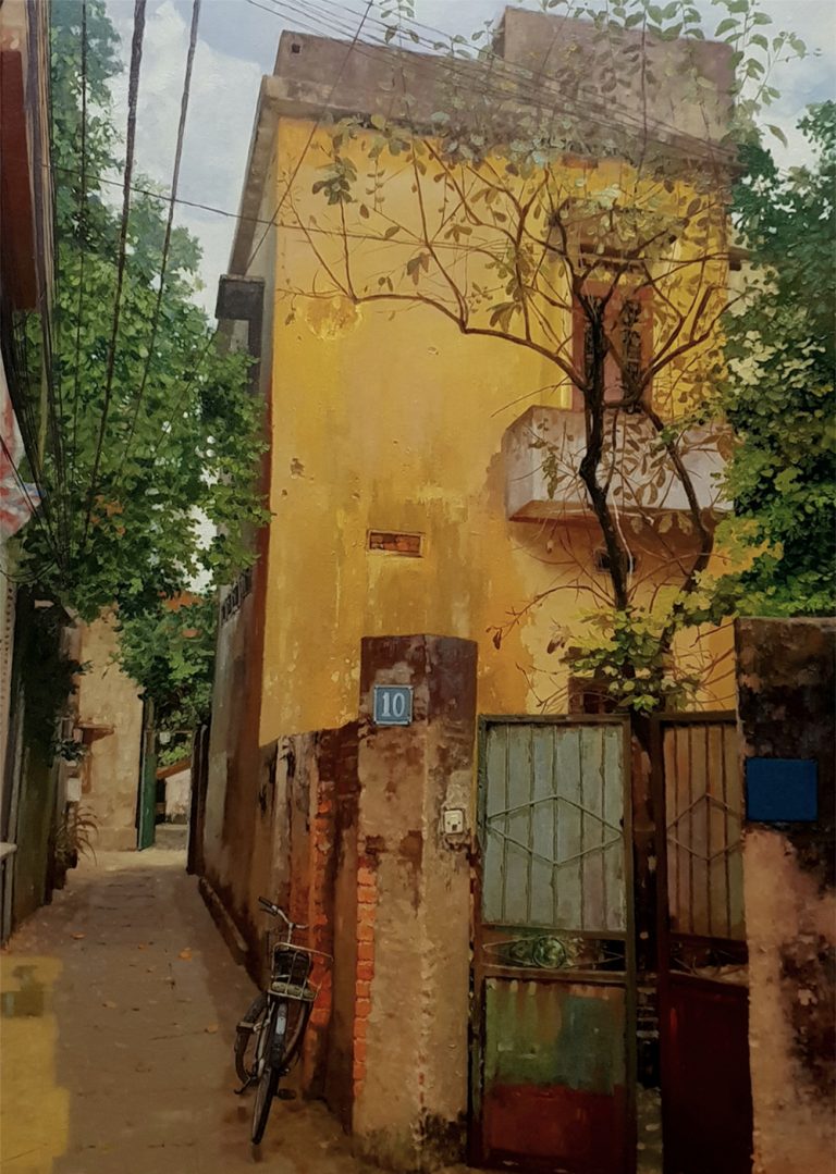Cũng với đề tài phong cảnh, họa sĩ Nguyễn Ngọc Anh khắc họa những hẻm nhỏ, con đường, bức tường cũ… Trong bức “Một thời vàng son”, anh dùng gam màu vàng trầm, sẫm để hoài niệm về thời xa xưa, khi xe đạp còn phổ biến, nay chỉ thấp thoáng trên phố.