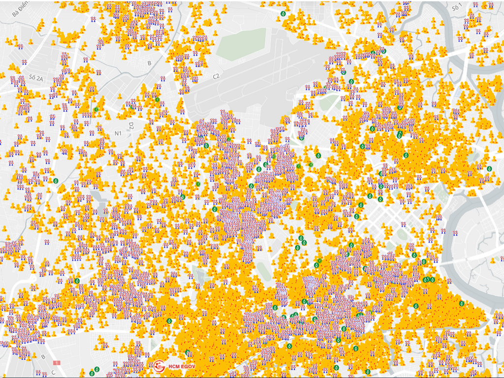 Bản đồ Covid-19 TP.HCM còn thể hiện đậm đặc ca dương tính (màu vàng) và khu vực có điểm phong tỏa (màu hồng) đến khuya 3.9