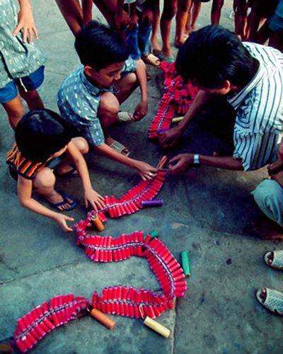Pháo và Tết luôn đi với nhau trong cả tâm thức và hiện thực đời sống. Xưa, chả ai không thuộc câu đối “Thịt mỡ, dưa hành, câu đối đỏ/Cây nêu, tràng pháo, bánh chưng xanh”. Tôi còn nhớ, thời đi học có bài thơ trong sách giáo khoa, tả một chiến sĩ cách mạng xa nhà khi dịp tết nhớ và mơ về quê hương “Mơ tết mơ xuân mơ tiếng pháo/Nhớ nhà nhớ cửa nhớ cành đa”, chỉ vậy thôi mà thật cảm động. Hay một người khác, “Đêm nay pháo nổ giao thừa/Mà người chiến sĩ không nhà còn đi”. Tiếng pháo để đánh dấu cái khoảnh khắc đặc biệt của trời đất lúc giao mùa, mà cũng là của lòng người khi chùng xuống trong cuộc đua tranh cùng thế sự.