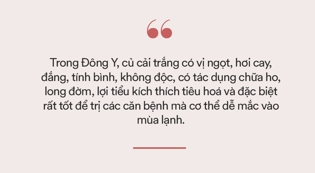 Không chỉ với người Nhật Bản mà ngay ở Việt Nam, củ cải cũng được Đông Y coi là một loại nguyên liệu quý. Trong Đông Y, củ cải trắng có vị ngọt, hơi cay, đắng, tính bình, không đ?̣̂?, có tác dụng chữa ho, long đờm, lợi tiểu ᴋɪ́ᴄʜ ᴛʜɪ́ᴄʜ tiêu hoá và đặc biệt rất tốt để trị các căn Ƅệпʜ mà cơ thể dễ mắc vào mùa lạnh.